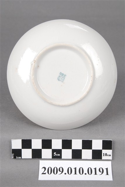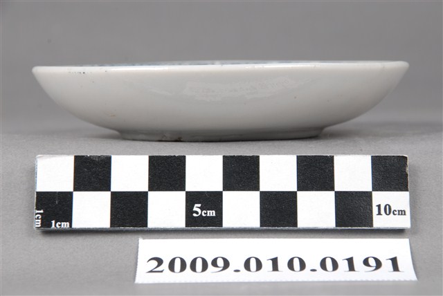 小圓碟。瓷質,仰式鏇壓法製作,底款:岐388。本件圓形小碟用以裝盛小菜之類的食物。平底,圓腹,圓唇,低圈足。器底有「岐388」款,説明它是日本岐阜縣二次大戰期間統制經濟下的製品。胎質潔白細緻,已達瓷化程度,為瓷器品質。全器以釉下彩青花裝飾。全器以五片櫻花花瓣開光裝飾,器緣景填滿許多小同心圓。器面飾有松竹梅歲寒三友圖,以松樹為主題,兩旁伴有梅花與修竹,中間有一座茅屋,前方有土坡,遠方有一座堆雪的富士山,頗具日本傳統繪畫的題材。各個題材都使用橡皮印章印花的工具裝飾,再用手工部分渲染,屬於一種量產化的技術,可得效果很好的畫面。整件作品施以透明釉,釉質清亮平滑,但仍見到一些色斑。畫面構圖疏密有致,色調高雅,製作相當精良。