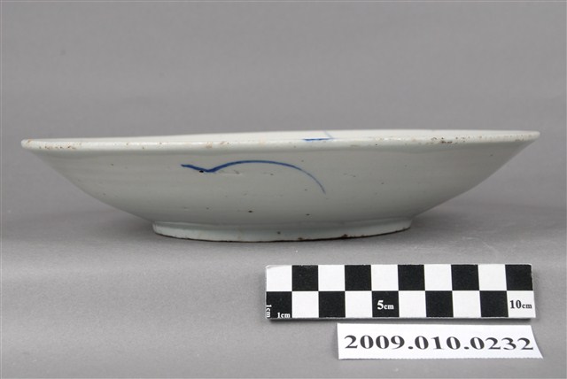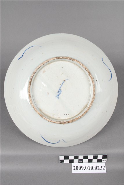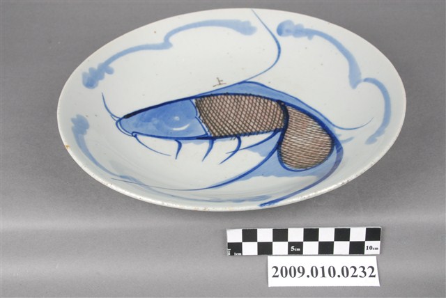 1. 手繪白瓷青花釉裡紅魚紋圓盤圓唇,侈口,淺圓腹向圈足收斂,大圈足,圈足露胎,胎色較白且細膩。全器施白釉,釉色光滑瑩潤。外壁素面,僅以數條藍釉妝點,營造水波紋般的效果。盤心以鈷藍釉及紅釉繪單隻鯉魚,鯉魚身形豐碩,特徵捕捉地恰到好處。魚身周圍點綴波狀紋飾,暗示水中植物的樣貌。整體構圖簡單,但筆法遒勁,尤以描繪鯉魚尾部的擺動使得畫面富有動感。2. 鯉魚紋樣的裝飾自明末清初便成為民間用瓷常見的裝飾紋樣,更因輸入臺灣後成為早期瓷器中常見的裝飾。鯉魚除本身的吉祥寓意外,整尾的魚紋更帶有「好頭好尾」之吉祥寓意。