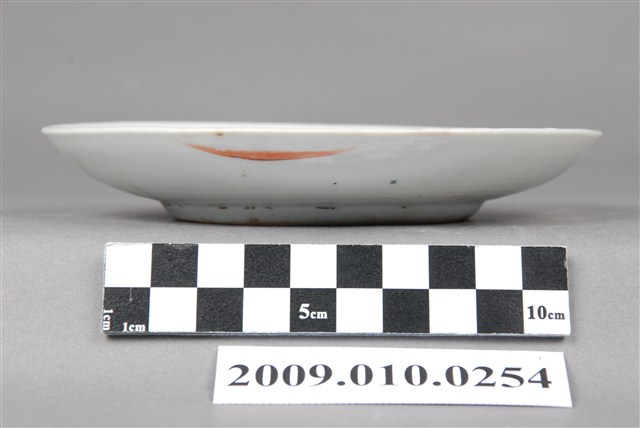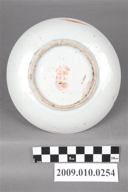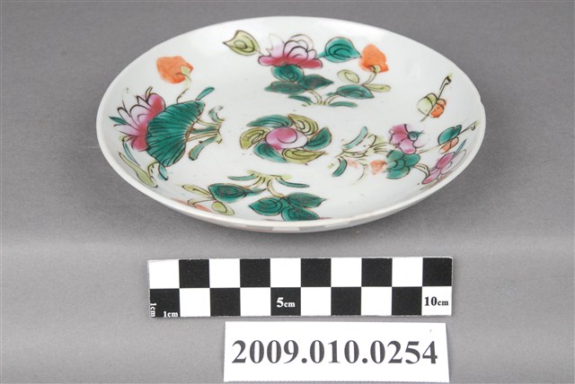 圓盤,用於裝盛菜肴。胎質細緻,瓷質。轆轤拉坏法製作,平底,深圓腹,圓唇,低圈足。全器以釉上彩繪裝飾,圈足內有橘紅釉楕圓形的文字款,但字跡模糊,可能是「景德鎮群裕謙」。中國景德鎮一家可能稱為「群裕謙」陶瓷廠的製品。器壁外畫有兩條橙色短線,主要紋飾在器壁內。先以黑色色料描繪輪廓,再加以填彩。畫面中心是粉紅色的花卉,周圍畫有幾片綠葉,以逆時針方向排列,成為視覺的焦點。主紋飾上下左右各畫有四組構圖相似的花卉紋,每組花卉都有兩個分枝,上面都有胭脂紅與橙紅的花卉與綠色的葉子,每組題材都不同,但無法確認究竟為何種花果。畫工技法老練,線條簡略,黑色、橙色、粉紅色與綠色主導畫面,色彩鮮明而生動活潑,具有富貴華麗之感。