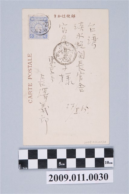 郵戳有明治38年11月5日寄達淡水蓋戳,東京寄出郵戳有27字樣,推測為明治38年10月27日寄出蓋戳