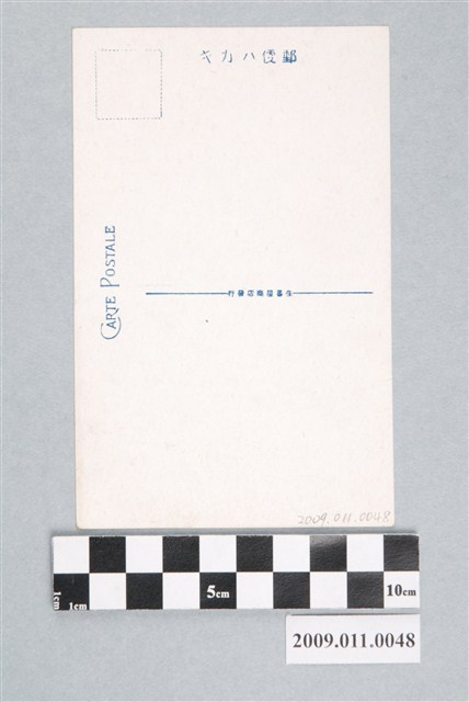 1. 日本時代有色印刷明信片,圖片影像為一泰雅族少女,正面半身照,少女倚坐在棚架下,頭髮略微中分向後梳理,頭戴貝板飾品,雙耳穿戴大型管狀耳飾,臉部僅刺額紋,上身內穿紅色胸兜,胸前綴滿白色鈕扣排列而成之V型圖紋,外著白色長袖短上衣,右肩斜披紅、白、藍、綠4色條紋披肩,右手腕戴著多串黃色手環,雙手自然置於腿上,惟雙手指間似有不明白色物體,造成右手指影像不甚清晰。