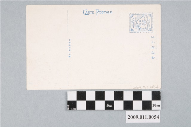2. 明信片正面底邊印刷文字「花蓮港木瓜蕃 SAVAGES OF MOKKA, KARENKO」。背面印刷文字「郵便はのき,CARTE POSTALE,臺北新高堂發行」,左上角印有一藍色郵票黏貼方框,框內有鳥類、竹葉圖案,印刷文字「TOKYO DESIGN PRINTING Co.,登錄商標,TRADE MARK,KANDA TOKYO」,其餘空白。