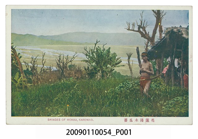 1. 日本時代有色印刷明信片,圖片影像為1名太魯閣族男子(日本時代舊分類屬泰雅族),頭綁紅色額帶,雙耳配帶長耳飾,上半身赤裸,雙手交握在肚子前,下半身著紅色遮布,腰際配戴一只長彎刀,站在茅草屋前空地,背景可俯視花蓮港灣景色。