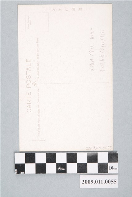 2. 明信片正面上方印刷文字「(D. 31) THE FORMOSAN IN SAVAGES (蕃人風俗)台灣バロン社蕃人」(中譯:原住民風俗-臺灣巴陵社原住民)。背面印刷文字「郵便はかき,CARTE POSTALE,MADE IN JAPAN,THIS SPACE MAY BE USED FOR COMMUNICATION,ADDRESS ONLY TO BE WRITTEN HERE」,右上角郵資黏貼框內印刷文字「PLACE POSTAGE HERE」。另,右下角空白處有先前收藏家鉛筆書寫字跡「巴陵社/合歡 肚兜小 東城有否/¥500/1995。