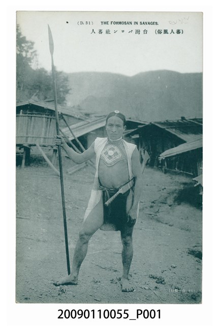 1. 日本時代黑白印刷明信片,圖片影像為一泰雅族男子,頭髮中分後束,頭頂上繫一圓形貝板頭飾,頸部配戴貝珠項鍊,上衣著白色無袖長上衣,胸前披掛五角形白鈕扣裝飾胸兜,腰部以下繫前遮布,左腰際配掛一開山刀,右手持一高於身高的長矛,雙腳赤足,站姿英挺,背景為竹木搭建的家屋與穀倉。
