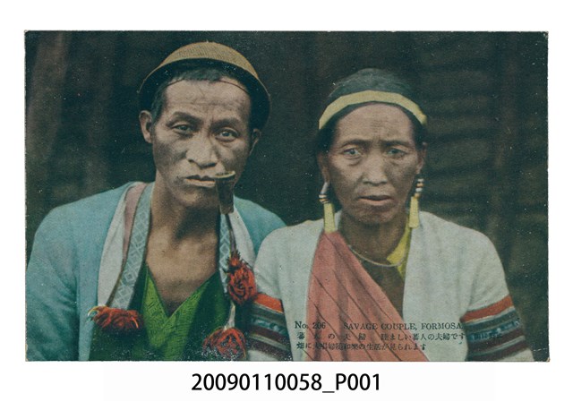 1. 日本時代有色印刷明信片,圖片影像為一對穿著傳統服飾的泰雅族夫妻半身合照。左側男子蓄短髮,頭戴圓形籐帽,口中叨一竹煙斗,身穿淺綠色上衣,頸部披掛一條刺繡紅毛線流蘇布質綴飾,胸前披掛綠色胸兜。右側女子額頭頂配戴一條方形貝板頭飾,雙耳配戴珠串貝板耳飾,頸部配戴一條銀項鍊,身穿白色長袖上衣,衣袖手臂夾織彩色條紋做裝飾,自右肩斜下披掛一條紅底紅條紋之披肩。