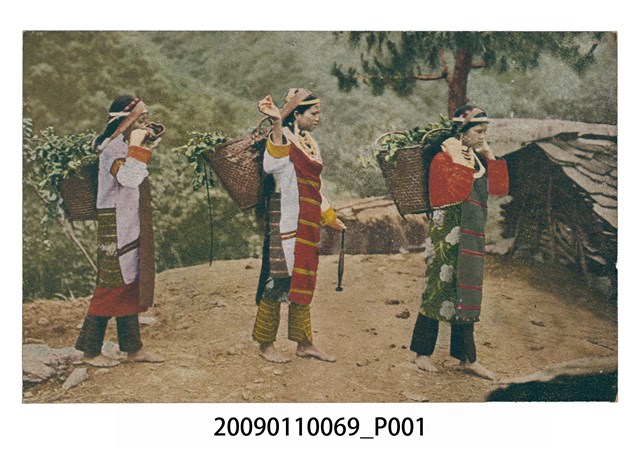1.背面有日文說明:霧社に來て先つ人目を惹くものは籠を背負つた蕃婦の群の風貌である。來到霧社最引人注目的就是背負籐籃的原住民婦女。 2.當中畫面為三個賽德克族女子,其中一個的衣服除了原住民服飾外,還有疑似日本服飾的布。