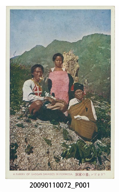 1. 日本時代有色印刷明信片,圖片影像3名泰雅族男女,蹲坐在山頂,背景為枯木與遠處高山。左側男子膚色黝黑,臉部刺額紋,口中叼一大煙斗,上衣著白色長袖上衣,胸前佩掛五角形紅底白鈕扣裝飾胸兜,右肩斜下黃色背帶。中央女子上衣著白色無袖上衣,胸前橫披一條紅白條紋披肩。右側男子年齡長,臉部刺額紋,頭綁黑色、紅底鈕扣裝飾頭巾,嘴中叼著一長煙斗,上衣著白色長袖上衣,自左肩斜下胸前披蓋一條黃褐色披肩。