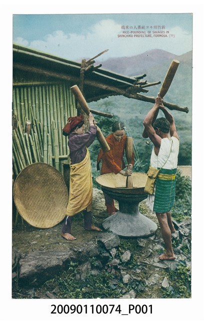 1. 日本時代有色印刷明信片,圖片影像為3名泰雅族人(2女1男)各持一木杵環繞木臼旁一起搗米,背景為綠色竹牆房屋,屋旁放置一竹篩,木臼中央易放置竹篩。左側女子服飾頭綁紅色頭巾,身穿紫色長袖上衣、左肩斜掛黃色披肩,小腿綁縛紫色護腳布,赤足。中央女子頭髮中分無頭巾,身穿紅色長袖長上衣,小腿綁縛紅色護腳布,赤足。右側男子背對攝影者,蓄短髮,髮色略為灰白,口中叼一煙斗,身穿米白色無袖長上衣,上衣背面腰部以下夾織綠色(間雜黃、紅細紋)條紋裝飾,左腰際有一黃色背袋,赤足。明信片上註記為新竹州Kiyo社,推測為今新竹縣、桃園縣一帶之泰雅族。