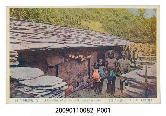 1. 日本時代有色印刷明信片,圖片影像為4名布農族人(2名男子及2名孩童)站在石板屋前的窄小空地。本影像為日本人類學家森丑之助於1906(明治39)年10月拍攝,拍攝地點為布農族干卓萬社(Kantaban)。根據森丑之助的紀錄描述,干卓萬社分布於濁水溪上游,其住屋屋頂及牆壁皆以板岩堆砌建造,為了防風及防禦敵人,通常在住家前方以板岩堆砌石牆,此種建築形式常見於干卓萬及丹社群,屋簷下懸掛著許多頭蓋骨,多為獵首自鄰近地區霧社或萬大社的賽德克族(舊分類稱泰雅族)。