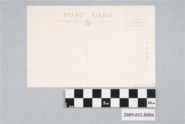 2. 明信片正面底邊印刷文字「(南蕃バタカン社)人物又ハ種種ナル品物ヲ運搬ス」(中譯:原住民巴達岡社人員及物品運輸方式)。背面印刷文字「郵便はかき,POST CARD,Correspondence,Address」。右上角郵資黏貼處方框內印刷文字「Postage 1 1/2 Sen domestic 6 Sen foreign」,右下角有鉛筆書寫文字「750」,其餘空白。