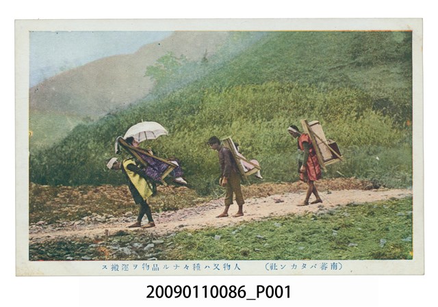 1. 日本時代有色印刷明信片,圖片影像為3名原住民男子排成一列走在山區泥土路上,背上以木架分別依序背負著1著和服及撐陽傘女子(左)、穿洋服的小女孩(中)、裝箱物品及皮箱(右)。