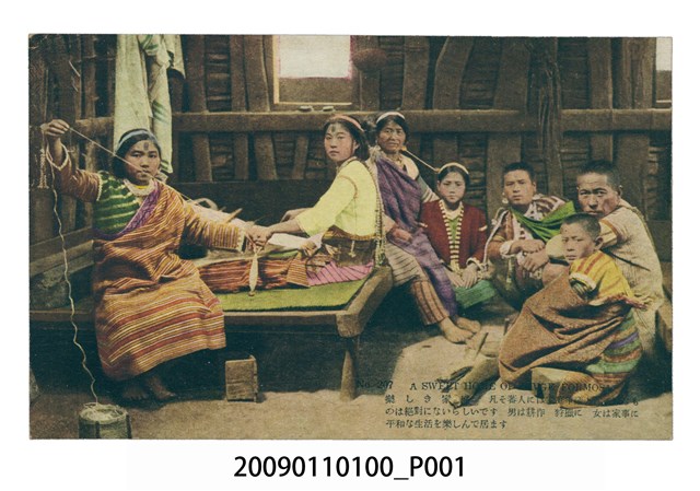 1. 日本時代有色印刷明信片,圖片影像刻意描述一和樂的泰雅族家庭男耕女織各司其職的快樂情景,圖中共有7人(4女3男)坐在竹木搭建的房屋內,左1女子正展開雙手揉撚織布用的線。左2女子以水平背帶織布機織布。左3婦人為一家之母,口中叼著長煙斗,左手搭在右側女兒肩後。左4女子著紅色上衣坐在地上。右側3名皆為坐在地上的男子,中央為年長的爸爸,其前後為兒子,眾人目光皆朝攝影者看來。
