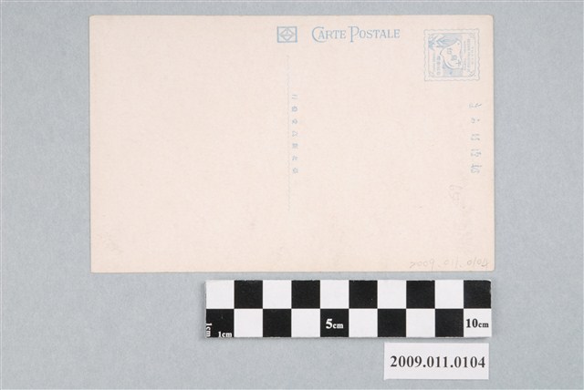2. 明信片正面右上方印刷文字「S14 臺灣タバホ社蕃人ノ住屋 HOUSES OF TAIWAN SAVAGES」(中譯:臺灣田埔社原住民的住屋)。背面印刷文字「郵便はのき,CARTE POSTALE,臺北新高堂發行」,左上角印有一藍色郵票黏貼方框,框內有鳥類、竹子圖案,印刷文字「TOKYO DESIGN PRINTING Co.,TRADE MARK,千鳥印,登錄商標,KANDA TOKYO」,其餘空白。
