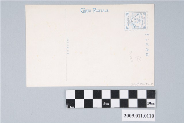 2. 明信片正面底邊印刷文字「臺灣生蕃 SAVAGES OF FORMOSA」(中譯:台灣原住民)。背面印刷文字「背面印刷文字「郵便はのき ,CARTE POSTALE,臺北新高堂發行」,左上角印有一藍色郵票黏貼方框,框內有一鳥類圖案,印刷文字「TOKYO DESIGN PRINTING Co.,登錄商標,TRADE MARK,KANDA TOKYO」,其餘空白。