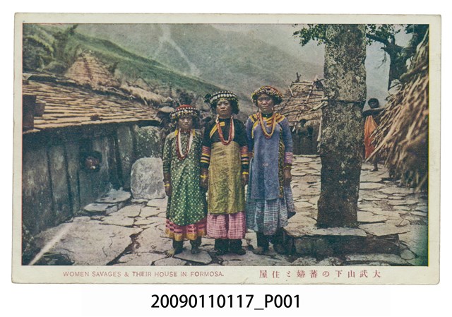 1. 日本時代有色印刷明信片,圖片影像為3名盛裝的排灣族婦女並肩站立在家屋廣場石雕立柱旁,背景為許多石板屋,屋內及屋旁有若干探頭圍觀的族人。左1女子,頭戴金屬片裝飾之花冠頭飾,身穿綠底白點仿漢式開右襟長袖長上衣,頸部配帶多串琉璃珠項飾,下半身搭粉紅色、黃色長裙,小腿綁縛護腳布、赤足。中央及右1女子裝扮與左1女子雷同,為服飾顏色略有不同,分別為黑黃上衣、藍色上衣,搭配格子印花布。