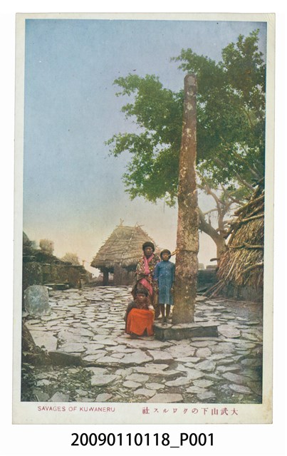 1. 日本時代有色印刷明信片,圖片影像為3名排灣族人站立在高聳的石柱旁,背景為茅草屋、石板屋、石板鋪設的地面。左1孩童蹲踞在前,短髮,著黑色上衣紅色裙。中央站立男子,短髮,身披花布披肩。右1孩童站立在石柱旁,短髮,著漢式藍色對襟長袖長上衣,赤足。