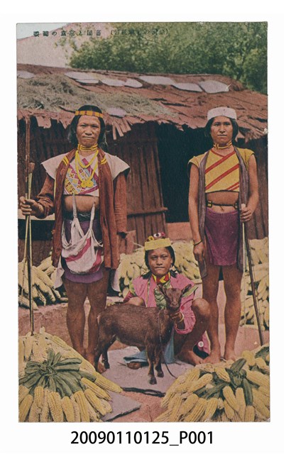 1. 日本時代有色印刷明信片,圖片影像為3名布農族男子站在家屋前的空地上,周圍環繞許多堆曬乾的黃玉米,左右兩男子手持弓箭直挺站立,中央男子蹲著,前方牽著一隻捕捉到的山羌,背景房屋為木材與茅草搭建而成。