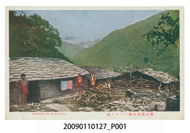 4. 本張影像推測為布農族巒社群,約居於南投縣信義鄉及花蓮瑞穗、玉里、卓溪各鄉境內。據考日本時代玉里支廳璞石閣地區布農族聚落以大分社為主,並無稱作Bubunuru之族社,推測ブブヌル可能為明信片印刷打字誤植。