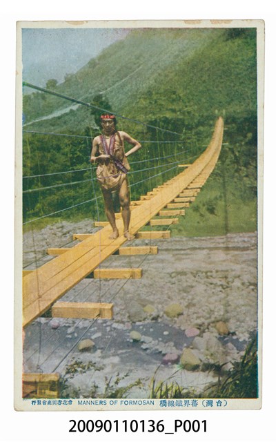 1. 日本時代有色印刷明信片,圖片影像為一男子立於吊橋上,頭帶貝板額帶,胸前掛一發火袋及腹背袋,腰際配掛一長刀,背景為吊橋延伸的另一盡頭山脈,喬下則為滿布礫石的河床。男子從服飾特徵判斷推測為鄒族,但吊橋所在地不詳。