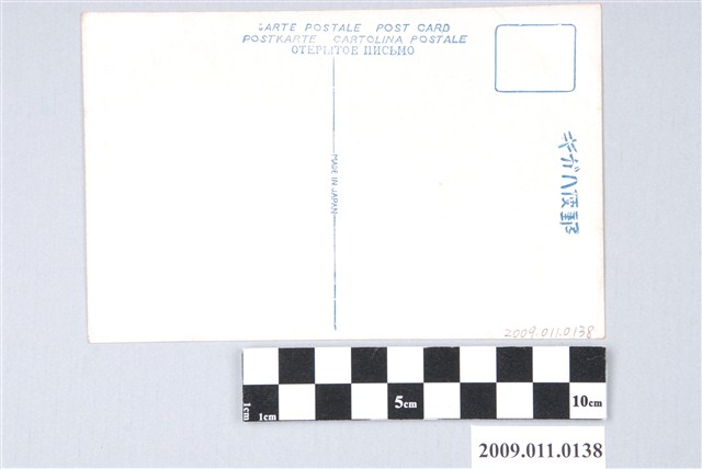 2. 明信片正面底邊印刷文字「(台灣) ツオウ族蕃人ノ音樂 Music by Tsou Savage, Formosa (生蕃屋發行) 39」(中譯:臺灣鄒族原住民的音樂)。背面印刷文字「郵便ハガキ,CARTE POSTALE POST CARD POSTKARTE CARTOLINA POSTALE OTKPbITOE IIИCbMO,MADE IN JAPAN」,其餘空白。