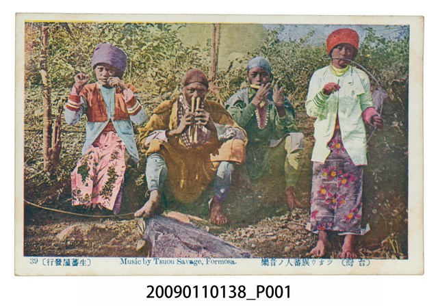 1. 日本時代有色印刷明信片,圖片影像為4名原住民男女(2男2女)坐在草叢前空地上吹奏鄒族傳統樂器。左1女子吹奏口簧琴,頭戴紫色頭巾,上身內著藍色條紋襯衫,外搭紅色長袖短上衣,下半身著粉紅色印花花布長裙。左2男子吹奏雙管鼻笛,頭帶棕色皮帽,身穿棕色上衣,胸前佩掛貝殼裝飾飾品,下半身著白色後敞褲。右2男子吹奏橫笛,衣飾同左2男子,頭戴藍色皮帽,身穿綠色上衣,胸前佩掛貝殼裝飾飾品,下半身著淺綠色後敞褲。右1女子彈奏弓琴,頭戴紅色頭巾,上身著淺綠色條紋襯衫,下身著紫色印花花布長裙。