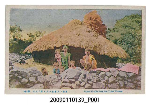 1. 日本時代有色印刷明信片,圖片影像為1男子右手抱1小孩,身旁有6名孩童站在石牆後,背景為一棟以茅草、竹子搭建的家屋。