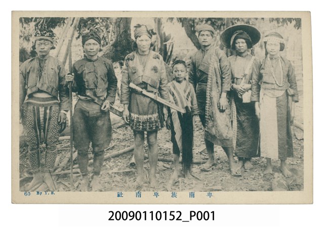 1. 日本時代黑白印刷明信片,圖片影像為7名卑南族男女(4男2女1孩童)並肩而立之合照。右1女子頭綁頭巾,戴銀額飾、兩條項鍊,身穿長袖短上衣、及踝長裙,赤足。右2女子頭戴斗笠並綁頭巾,服飾與右1女子大致相同,惟左肩背了一個檳榔袋。右3男子頭戴圓帽,身穿長袖短上衣、短裙,左肩披著一條長披肩,兩腳穿日本木屐。右4即中央為一男童,短髮,身穿條紋長衣,赤足。左3男子頭綁頭巾,身穿綴流蘇長袖對襟短上衣及短裙,赤足,左腰際配戴一支長禮刀,刀尾端綴著一大束黑色長流蘇。左2男子頭綁頭巾,身穿開右袵長袖漢式短上衣,下身著素色後敞褲,赤足,右手持一長矛,左腰際配戴長禮刀。左1男子之服飾與組2男子大致相同,惟後敞褲為菱形花紋,無佩刀。