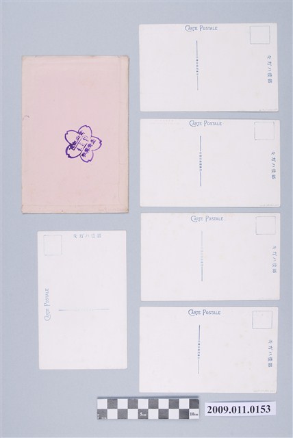 「霧社風光」明信片組,包括封套1個,明信片5張,共計6件。封套背面有1929(昭和4)年8月10日霧社登山紀念櫻花花形戳印,明信片則為生蕃屋商店發行,影像主題包括霧社的臺車、霧社的櫻花、霧社賽德克族的穀倉、霧社古道人止關、 南投埔里耶馬溪等自然景觀、人文風俗景觀。