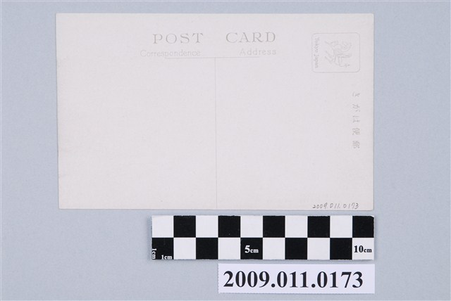 日本時代彩色印刷明信片。正面圖為建功神社正面照。左下角說明文字:「(臺灣臺北)建功神社:臺北植物園內あり,本島改隸以來國家公共の為職に殉じた,一萬六千六百六十余柱の英靈を合祀されてねる。」(譯:建功神社,位於臺北植物園內,合祀自日本領臺以來為國家殉職的16660多名的英靈。)背面印刷有「POST CARD,郵便はがき,Corresondence,Address」等字。郵票張貼處則印有「Tokyo Japan」。本圖約為1930年代拍攝。