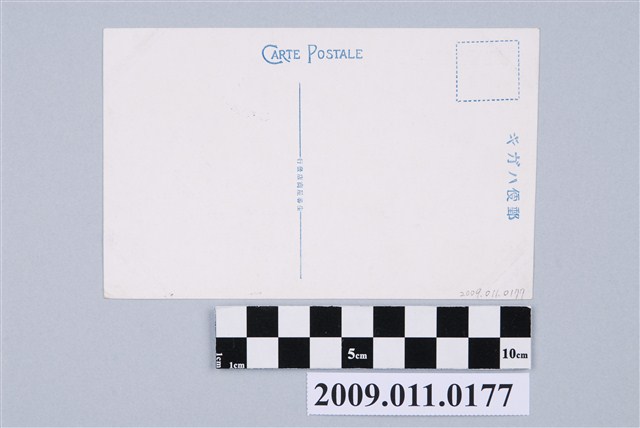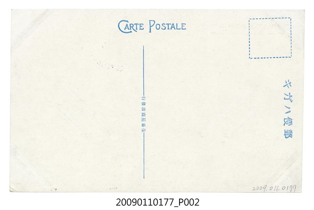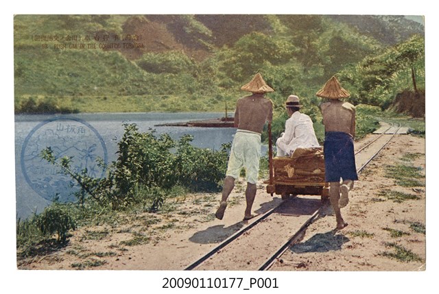 日本時代彩色印刷明信片,生蕃屋商店發行。圖為由2名赤著上身、頭載斗笠的工人,以臺車載送1名身穿白色西裝、頭載紳士草帽男士的景象,上有說明文字:「(台灣)手押台車(田舍ノ交通機關)93. PUSH CAR IN THE COUNTRY, FORMOSA」(中譯:手押台車為鄉下使用的交通工具。)並蓋有「角板山登山記念」印戳,推測影像地點可能為桃園角板山。背面印刷有「CARTE POSTALE、郵便ハガキ、生蕃屋商店發行」等字,其中明信片以法文「CARTE POSTALE」標示。本件約為大正、昭和年間1920-1930年所發行。