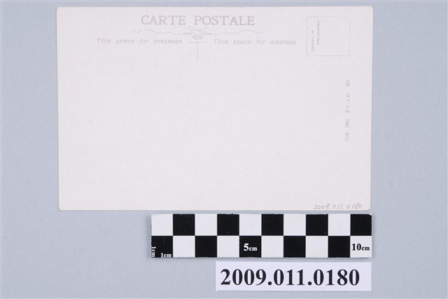 2. 明信片正面左上角方印刷文字「Savage women singing over their poundering Taiwan」(中譯:臺灣原住民婦女擊杵唱歌),正面底邊印刷文字「﹝臺灣の風物﹞蕃歌杵聲 日月潭の湖岸に一面の石が用意してあり數名の化蕃の女が周圍に立ち各二メト─ル餘の長い杵でこれを搗けば不思議にも一種の樂律をなす。側に數名の老婦がるて一尺ばかりの竹筒で輕く地を打ち奇妙の音を發し杵聲の調子を助ける。これは觀光客が日月潭の湖岸で聞く臺灣名物の一ッである。」(中譯:臺灣風俗原住民杵歌。在日月潭的湖岸旁,數名邵族婦女圍成一圈,手中拿著約兩公尺長的木杵,敲擊放置於地面的石頭,形成一種不可思議的奇妙音樂,身旁另有數名老婦拿著長約一公尺的竹筒,輕敲地面發出其妙的聲響為杵音伴奏,這就是觀光客在日月潭湖岸旁所聽到的臺灣名物之一。)。背面印刷文字「郵便はがき,CARTE POSTALE,TRADE(飛鳥圖案) MARK,This place for message,This place for address」,其餘空白。