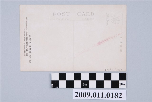 日本時代彩色印刷明信片。阿里山雲海圖。背面印刷有「POST CARD,郵便はがき」等字,以及說明文字:「(臺灣)阿里山の雲海:神女の織りなす羅裳は波濤の起伏するが如く雲亦雲を孕み新高の花として歎賞せられてね(?)る」(中譯:阿里山雲海有如仙女編織成的衣裳,波濤起伏,並孕育出新高山的花,令人讚嘆。)郵票張貼處印有「Tokyo Japan」。本件約為1920-1930年間發行。