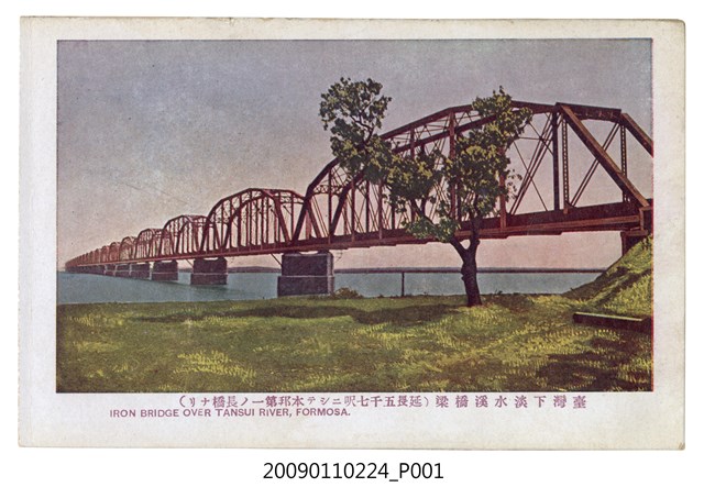 3.上有說明文字:「臺灣下淡水溪橋梁(延長五千七呎ニシテ本邦第一ノ長橋ナリ)IRON BRIDGE OVER TANSUI RIVER, FORMOSA。」(中譯:長達日尺5007尺(約1526公尺),為我國第一長橋。),背面則印刷有「CARTE POSTALE、郵便はかき、臺北新高堂發行」等字,以及日本東京設計、印刷的「千鳥印」印戳,登錄商標為「KANDA TOKYO」(東京神田)。本件為大正12(1923)年3月20日發行。