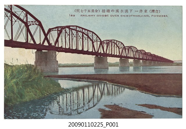 3.上有說明文字:「(台灣)東洋-下淡水溪の鐵橋(全長五千七呎)163 RAILWAY BRIDGE OVER SHIMOTANSUI-KEI, FORMOSA。」(中譯:下淡水溪的鐵橋全長日尺5007尺(約1526公尺)。),背面則印刷有「CARTE POSTALE、郵便ハガキ、生蕃屋商店發行」等字。本件約為1930-1940年間發行。
