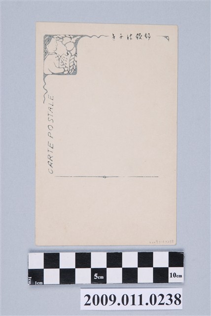 日本時代印刷明信片,圖片影像為2名穿著傳統服飾的鄒族男女並肩站立於樹下之手繪彩色水墨畫,男子在左,女子在右背後還背個一個幼兒。明信片正面上方印刷文字「A TSUOU MAN AND HIS WIFE」(中譯:鄒族男子與妻子),左上角則有「宜洲」之繪圖者署名。背面版印文字「郵便はのき,CARTE POSTALE 」,左上角有畫家持顏料盤作畫之圖印,其餘空白。