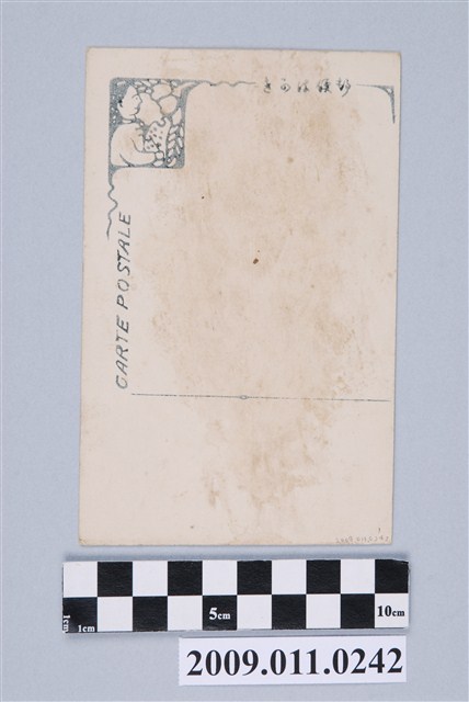 1. 日本時代印刷明信片,圖片影像為一艘小船航行在高聳峽谷中之手繪彩色水墨畫。明信片正面左下角隱約可見模糊手寫文字「大嵙崁溪上流??小行」,本張明信片無繪圖者之署名。背面版印文字「郵便はのき,CARTE POSTALE 」,左上角有畫家持顏料盤作畫之圖印,其餘空白。