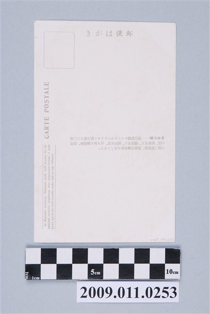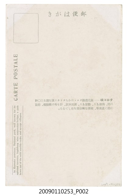 2.矢崎千代二(1872-1947)與石川欽一郎為同一輩畫家,擅長以粉彩速寫,捕捉旅行所見,昭和12(1937)年曾於臺北鐵道飯店舉辦過粉彩畫展,展出從北到南的臺灣名景,其中「日本旅行協會臺灣支部」精選其部分畫作,發行風景明信片。此張明信片描繪花蓮太魯閣巴達岡一帶(即今錐麓斷崖一帶)的峽谷風光。