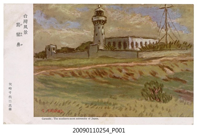 1.矢崎千代二以粉彩畫「鵝鑾鼻燈塔」,上印有落款「C. YAZAKI.」,為矢崎氏所繪「臺灣風景」系列明信片之一。正面說明文字:「台灣風景、鵞鑾鼻、Garanbi; The southern-most extremity of Japan.、矢崎千代二氏筆」,背面除印刷有「CARTE POSTALE、郵便はがき」外,以日文、英文二種語言介紹「The light-house was built in 9th of Kocho by British, under the Chinese Government and kept as the armed light-house.」、「ガランビ…黑潮躍る極南の勝地,ガランビへは潮州驛から自動車で三時間。木麻黃の坦道が盡きるあたり城郭に圍れた恒春街を過ぎ沿道の南國情緒豊かな風光を痛快なドライブが樂しめる。」(譯:鵝鑾鼻,是黑潮流經的極南勝地,從潮州站搭車往鵝鑾鼻需3小時。木麻黃平坦大道的盡頭是被城牆圍起的恆春街。可以痛快享受奔馳於沿途充滿南國情調的風光樂。)本件約為1937-1940年間發行。