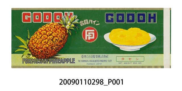 本件為昭和年間的臺灣合同鳳梨株式會社(FP,The Formosan Consolidated Pineapple Co.,Ltd)出品的「CODOH-FORMOSAN PINEAPPLE」牌鳳梨罐頭的商標標籤紙,為550公克整片裝(ラセン),底色以墨綠色配淡綠色為主,圖案為整顆鳳梨,及以白色瓷盤裝盤的鳳梨整片切片。