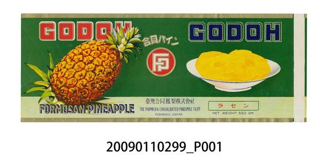 本件為昭和年間的臺灣合同鳳梨株式會社(FP,The Formosan Consolidated Pineapple Co.,Ltd)出品的「CODOH-FORMOSAN PINEAPPLE」牌鳳梨罐頭的商標標籤紙,為550公克整片裝(ラセン),底色以墨綠色配淡綠色為主,圖案為整顆鳳梨,及以白色瓷盤裝盤的鳳梨整片切片。