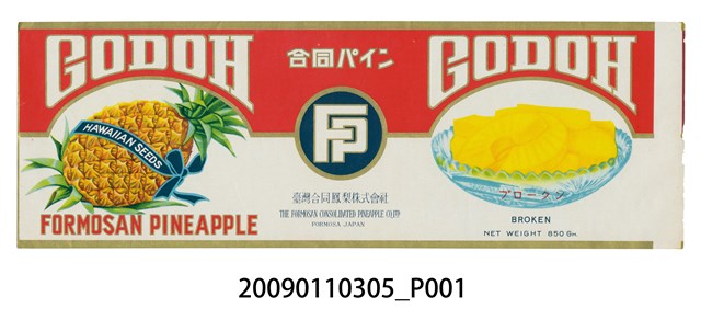 本件為昭和年間的臺灣合同鳳梨株式會社(FP,The Formosan Consolidated Pineapple Co.,Ltd)出品的「CODOH-FORMOSAN PINEAPPLE」牌鳳梨罐頭的商標標籤紙,為850公克二分片裝(ブロークン,BROKEN),底色以淡橄欖綠色配白色為主,圖案為綁著「HAWAIIAN SEEDS」字樣緞帶的整顆鳳梨,及切成二分片的鳳梨,以玻璃盤裝盤。