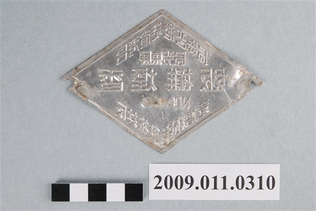 臺灣省菸酒公賣局屏東分局香煙攤販執照,編號:No.0245,上有「反共抗俄、緝私增產」標語,菱形鋁牌,編號及標語以紅字標示,其餘為藍字。