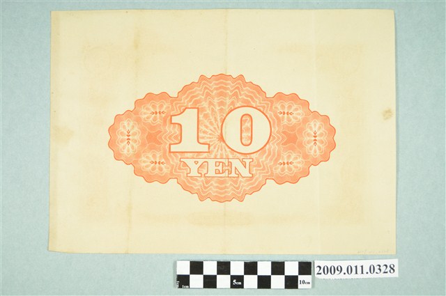 大日本帝國政府七七事變第四次發行折扣國庫債券(日名:大日本帝國政府支那事變割引國庫債券),日本銀行發行,郵便局賣出,面額拾圓,以折扣價七圓售出,第四次發行,編號:0265420,發行日:昭和十四(1939)年十二月十一日,發行價格:七圓,償還日期:昭和二十五(1950)年一月二十八日,內閣印刷局製造。正面印有藤原鎌足肖像及供奉藤原鎌足的奈良談山神社,中間為大藏大臣(即今財務大臣)具名列出的3項債券說明,邊框中間為代表日本天皇的十六瓣八重表菊紋,左上角及右上角為「拾圓」硬幣圖,背面印「10 YEN」圖。黑、橘色有色印刷。