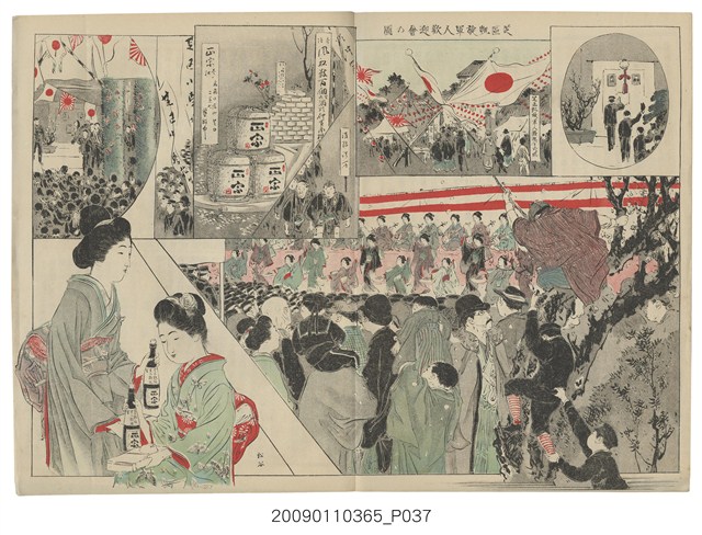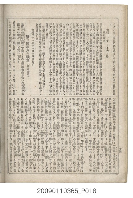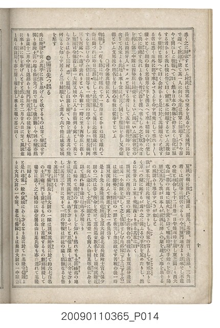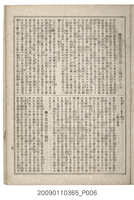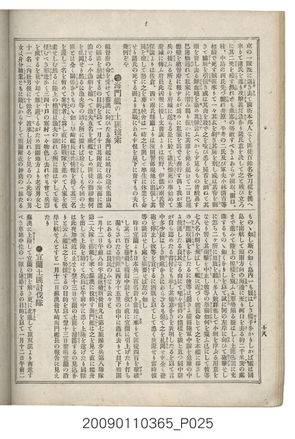 第1編封面圖為日本海軍即將上岸討伐土匪前,從軍艦上遠看臺灣島的情景,由尾形月耕所繪。內容分為論說、記事二部分,由大田才次郎論說「土匪」談起,描述日軍討伐臺南、下淡水、臺北城、宜蘭、坪林、礁溪等地土匪的情形。全書文字32頁,插圖13頁(含封面圖),附有板橋林維源邸宅圖,每本定價金拾錢。