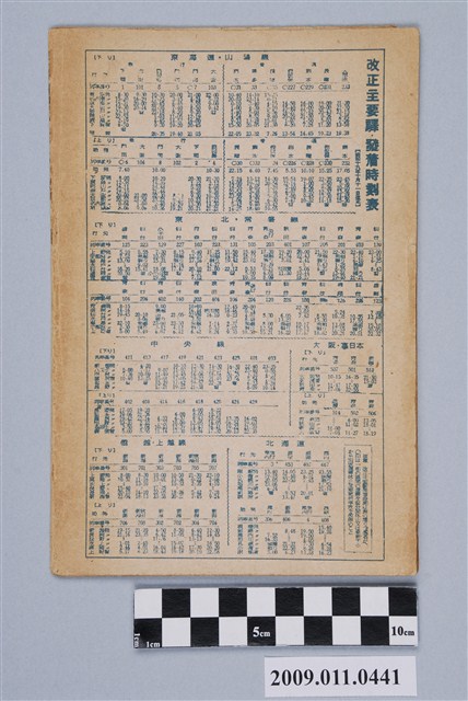 地圖封套背面印有昭和19年10月11日改正後主要車站時刻表,包括東海道山陽線、東北常磐線、中央線、大阪、北海道、信越上越線等支線上行、下行時刻。內頁印有「東京附近」鐵路交通圖,以及「國民すべて戰鬪配置,この一年旅行をやめ,增產に防空につとめよう,輸送戰に勝たずして,勝利の栄光なし!」(中譯:全體國民就戰鬥準備,停止今年一年的旅行,努力增產與防空!沒有贏得運輸戰的勝利,就沒有勝利的榮耀!)
