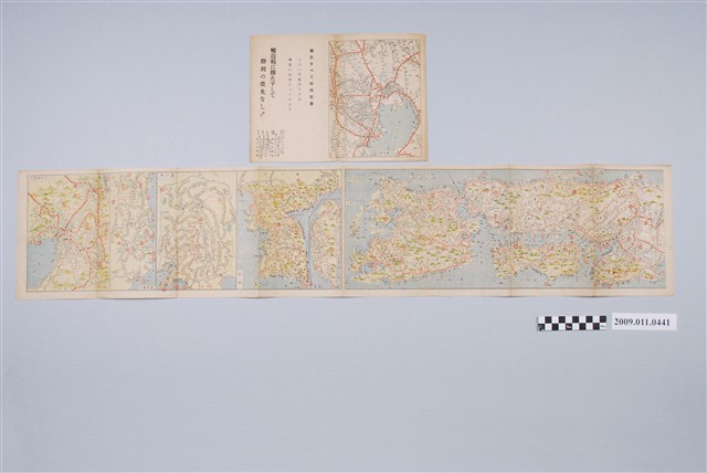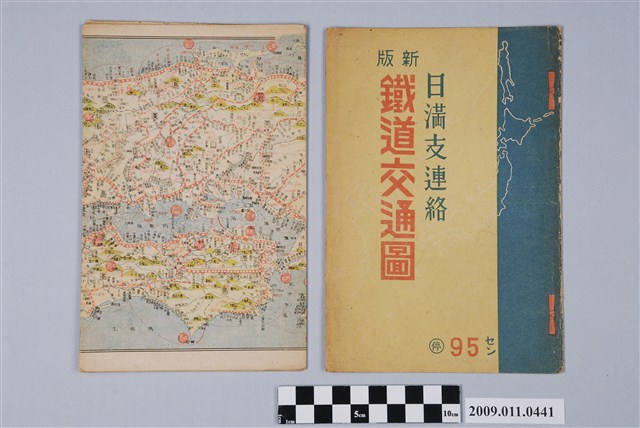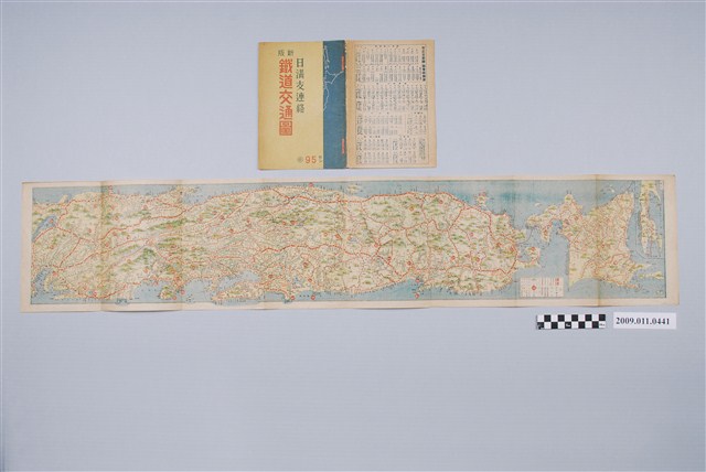 興亞協調會編〈日滿支連絡新版鐵道交通圖〉,彩色地圖。昭和19年(1944)11月25日印刷、12月1日發行。編輯兼發行人興亞協調會(橫濱市神奈川區三ツ沢下町五九),印刷所東方美術印刷所,發行所興亞協調會。定價含稅九十五錢。附有地圖封套及地圖各1件。