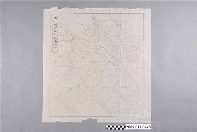臺灣總督府專賣局〈五萬分一新竹出張所內灣收納所〉,五萬分一等高線圖,為製腦地域圖。有指北標示。圖面範圍為ケィフィ、石牛山、六畜山、關西、ピヤワイ(比亞外)、カラパイ(嘉樂)、沙坑、芎林、ラハオ(拉號)、李崠山(今李棟山)、ヤバカン、メカラン(梅花)、三角山、上坪、マリコワン(馬里闊丸)、タバオ、油羅山、マイバライ(麥巴來)等地區,即今新竹縣尖石鄉、五峰鄉,在タバオ、カラパイ(嘉樂)、テンタナ(那羅附近)等3地設有巡視所,以及關西分室,除稜線、河川、州界、郡界、道路的標示外,並標示出製腦地界、出張所及監督所、收納所、巡視所、警察所在地、林班界、蕃界等樟腦產業情形,從圖面可以觀察出當時製腦的分界線大致是沿著稜線、河川等自然界線劃分,原住民部落社址大都設有警察駐在所。