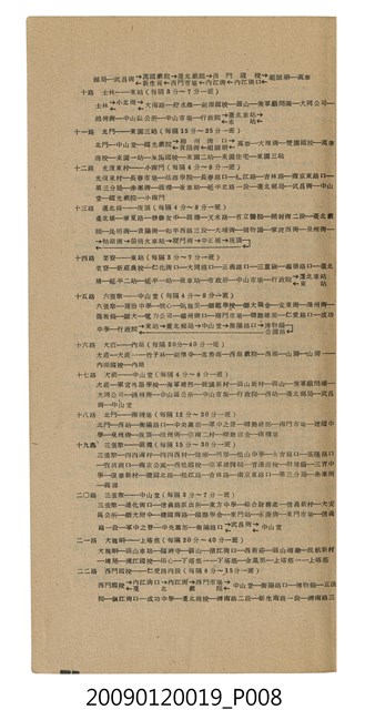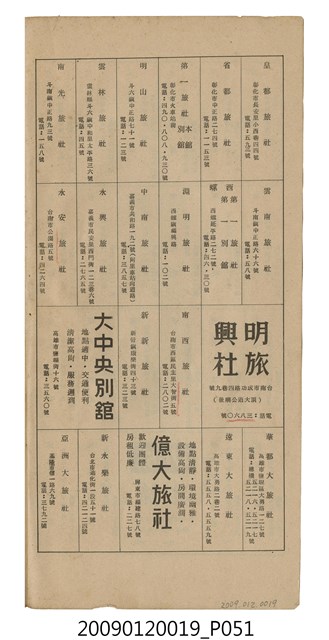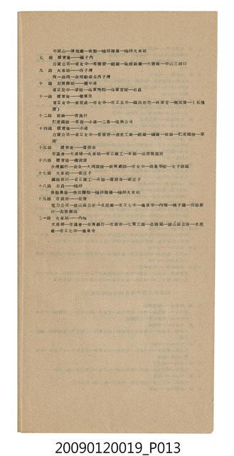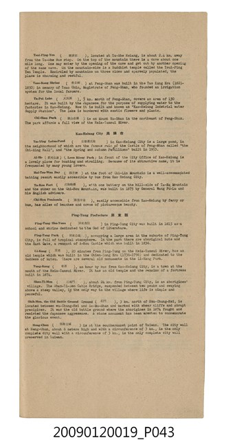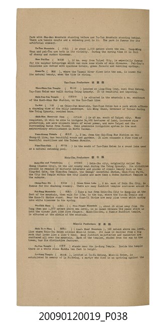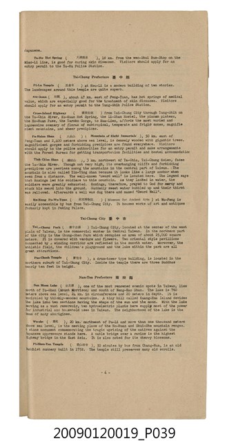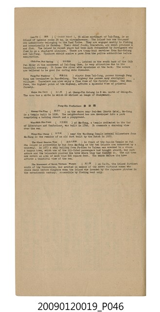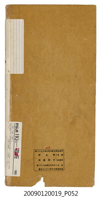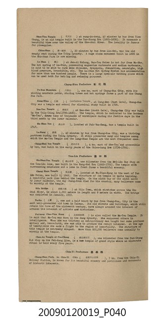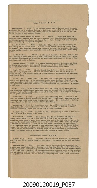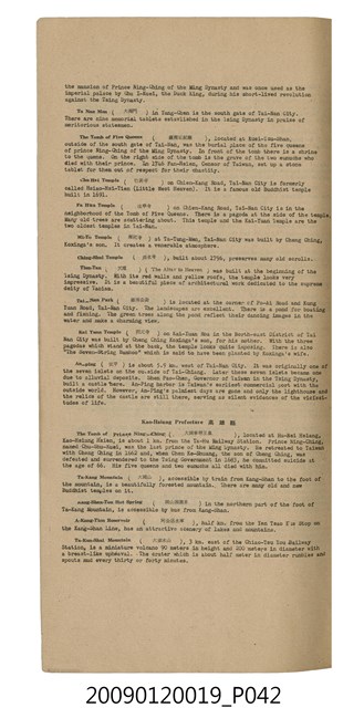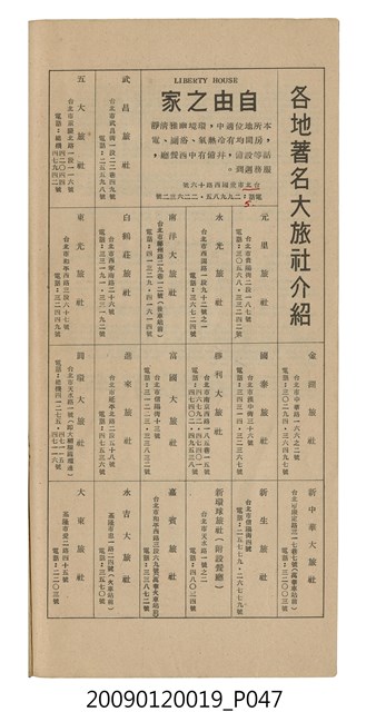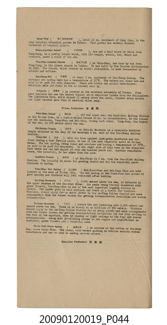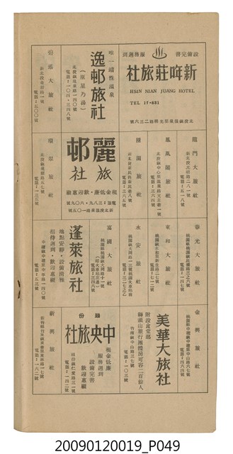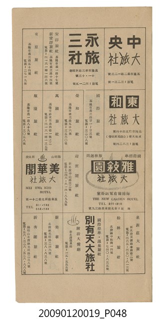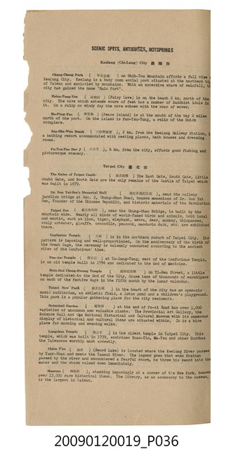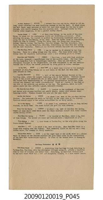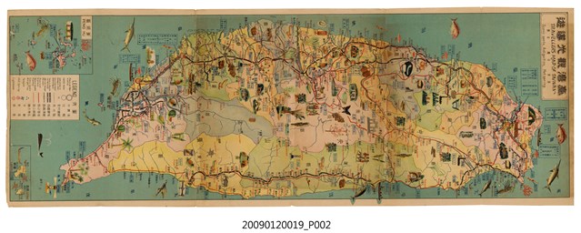 本物件為張永伸編著〈臺灣觀光導覽〉,封面為彩色印刷,右側貼有大約3張貼紙,上方有紅色中式紋路方框,內有TAIWAN,方框下方有TRAVEL GUIDE,右下方有1圓拱型,內為彩色印刷之圖片,繪製有一座在湖面上的宮殿式閣樓建築物,左側有臺灣觀光導遊、名勝、古蹟、溫泉;封底為土黃色,下方有1黑色方框,方框上方以紅字寫有45,方框內文字由上至下內政部登記證內景台業字三六O號、編者:張永伸、連絡處:中榮書局、地址:台中市民權路二O一號、郵政劃撥中字第二OO二五號。地圖摺頁正面為1幅彩色印刷的臺灣島嶼地圖,繪製有行政區分界、鐵路路線、道路交通路線、各地方中英文地名,觀光地點、以及各地方風景名產之插圖,左上方框中標有圖名臺灣觀光導遊、TRAVELLERS MAP OF TAIWAN、溫泉、古蹟、名勝、Scenic spots, Antiguities, Hot spring.,左下方有澎湖縣地圖及圖例之圖框,圖框內文字右側由上至下省轄市、縣治、鄉鎮村里、縣市界、省營鐵路、輕便鐵路、名勝古蹟、廟宇、溫泉、燈塔;左側由上至下Provincial Mun-icipality、Capital :Hsien、Adm. center or Hsiang or chen、Boundariesot Hsien or Munic、Ts'un. Li Provin-ical Railway、Narrow Gauge Railway、Provincial. Highway、Scenic Spots Antigui Ties、Temple、Hot Spring、Lightouse。摺頁背面以各行政區分類記述各觀光地點之簡介,附有臺灣海陸空交通路線地圖,並蓋有1枚藍紫色圓形印章,由右至左小煙、程英哲、敬藏,圓形戳章上又蓋有1枚方形朱印,其文字可能為小篆字體之程英哲。本書內頁記有全省鐵路各站里程表、臺灣鐵道營業線聯運圖、臺北市公共汽車各路停車站站名表、公路局臺北區路線圖、公路局臺中區路線圖、省公路局蘇澳區營運路線圖、高雄區路線圖、公路局枋寮區路線圖、文山汽車客運路線圖、桃園汽車客運路線圖、新竹汽車客運路線圖、曰新汽車客運社營業路綫圖、豐原汽車客運路線圖、彰化汽車客運路線圖、員林汽車客運路線圖、臺西汽車客運路線圖、嘉義汽車客運路線圖、嘉義縣公共汽車營業路線圖、新營汽車客運路線圖、臺南汽車客運路線圖、興南汽車客運路線圖、協成汽車客運路線圖、南投汽車客運路線圖、高雄汽車客運路線圖、屏東汽車客運股份有限公司路綫圖、澎湖縣公共汽車路線圖、SCENIC SPOTS, ANTICUITIES, HOTSPRINGS、各地著名大旅社介紹。