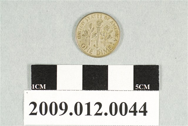 1.本物件是1960年製造之面額10美分(等於0.1美元)之美國錢幣。錢幣材質銀佔90%、銅佔10%。直徑約1.8公分,呈圓形,正、背面幣緣均有凸邊設計,幣邊採齒輪設計。錢幣正面中央鐫美國第32任總統羅斯福(Franklin Delano Roosevelt)面朝右肖像;肖像左下方自靠近幣緣處起由左而右鐫「IN GOD」、「 WE TRUST」兩排英文,中文意指「我們信仰上帝」;肖像左方自幣緣開始以順時針鐫「LIBERTY」字樣,中文指「自由」之意;肖像右下方橫鐫「1960」,代表錢幣製造年代。硬幣背面中央由右至左分別鐫橡樹枝、火炬、橄欖枝圖案,各象徵勝利、自由、和平,圖案偏下處自左而右鐫「E PLURIBUS UNUM」英文橫跨3個圖案,意指「合眾為一」,為美國國徽上的格言;火炬圖案左下側鐫「D」字樣,表示錢幣是由丹佛鑄幣廠製造;錢幣下緣處以逆時針方向鐫「.ONE DIME.」英文及符號,DIME指的是十分之一,即指硬幣的面額為十分之一元;硬幣上緣以順時針方向鐫「UNITED STATES OF AMERICA」英文,以示美國的國號全稱。2.美國在1776年獨立建國,1792年成立美國鑄幣局(United States Mint),負責製造流通貨幣。1796年,美國政府首度發行面額10美分的硬幣。本物件以羅斯福作為頭像的10美分硬幣始鑄於1946年,以紀念前一年去世的羅斯福總統;1965年,美國政府改以銅和鎳作為10美分硬幣的主要材質,本物件銀幣版本錢幣走入歷史。至今,美國仍以羅斯福的肖像作為10美分硬幣肖像。